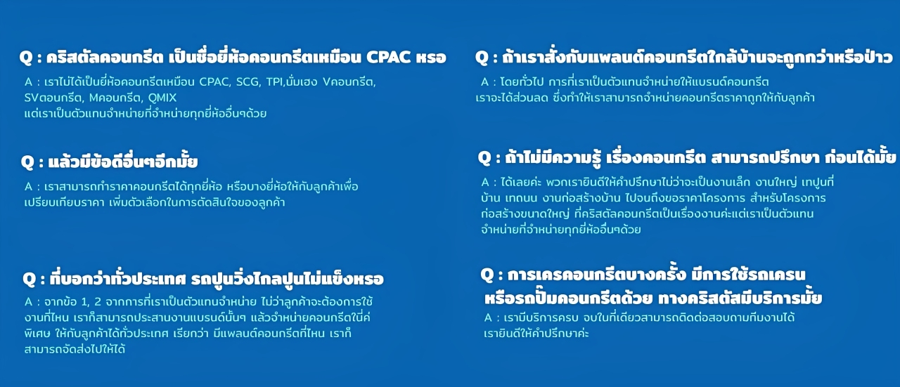 คริสตัลคอนกรีต เราคือตัวแทนจำหน่ายคอนกรีตผสมเสร็จ ทุกยี่ห้อในนามของบริษัท คริสตัล มาร์เก็ตติ้ง แอนด์ เซอร์วิส จำกัน